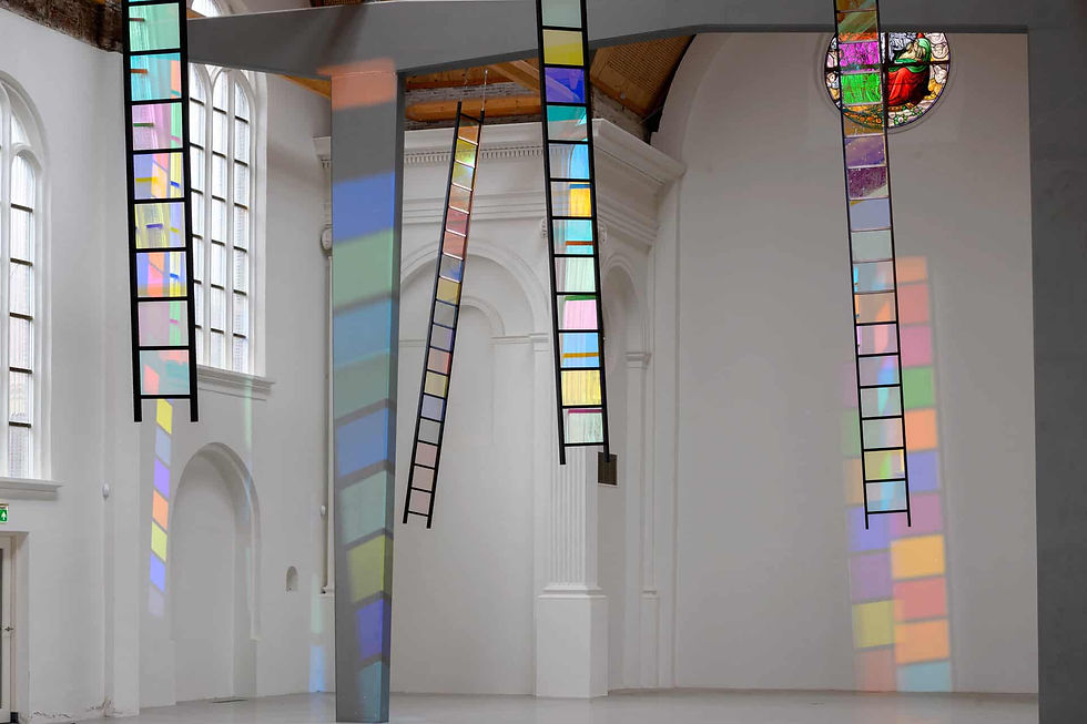 13.00 Ontmoet de ladder Bewegend door de opstelling van verkleurend glas en spelend licht inspireren we elkaarin het vinden en samenbrengen van onze vragen tot een groepsladder. De